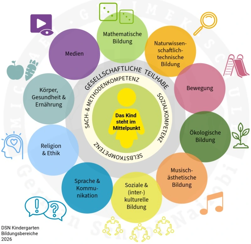 Im Mittelpunkt stehen Selbstvertrauen, Konzentration, Neugier und Freude am Lernen. Die Kinder lernen, Verantwortung zu übernehmen, zuzuhören, sich zu äußern und sich in einer Gruppe zurechtzufinden.