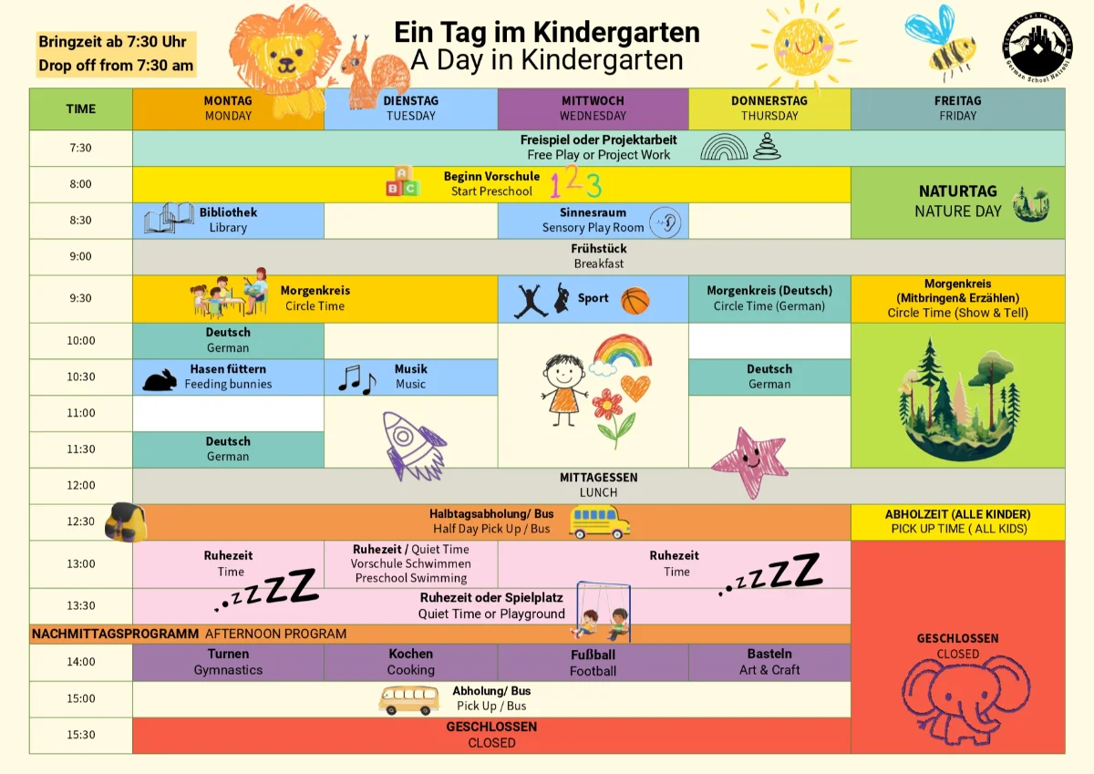 TIMETABLE KiGaEin klar strukturierter Tagesablauf gibt den Kindern Sicherheit und Orientierung. Feste Elemente wie der Morgenkreis, ein gemeinsames Frühstück, Projektzeiten, Spielen im Freien und Ruhephasen strukturieren den Tag und schaffen einen vertrauten Rahmen.