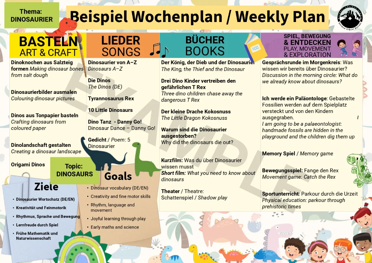 Bis zu 124 Kinder spielen und lernen in sieben attraktiv gestalteten Gruppen, betreut von deutsch- und englischsprachigen Pädagogen, die gemeinsam eine herzliche, altersgemäße und vertrauensvolle Atmosphäre schaffen. Das Lernen erfolgt in Projekten, die Bewegung, Musik, Kunst, Bücher und Natur miteinander verbinden mit viel Raum für Partizipation, Kreativität, Neugier und Spiel.