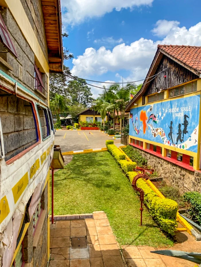 Der Schultag an der Deutschen Schule Nairobi beginnt um 7:30 Uhr, wenn die gelben Schulbusse auf den Hof rollen und die Schülerinnen und Schüler ihre Materialien aus den Schließfächern holen. Der Unterricht startet um 7:45 Uhr.